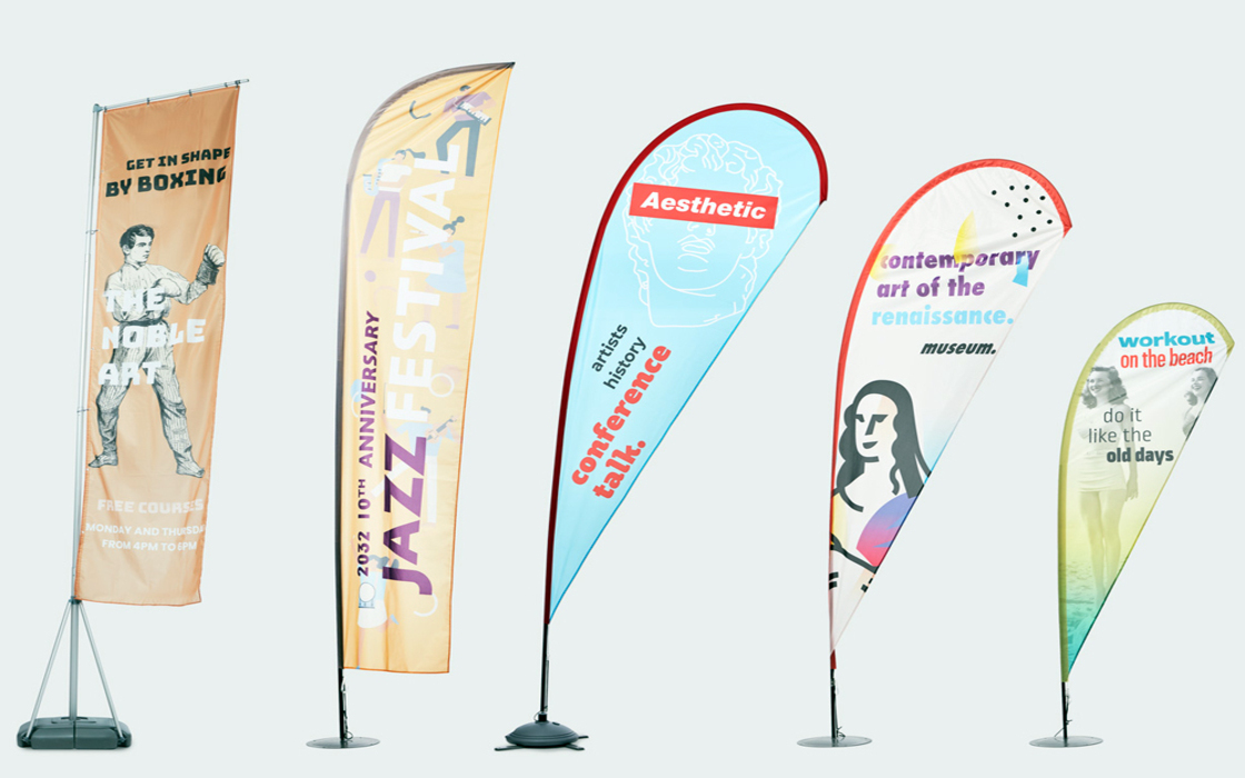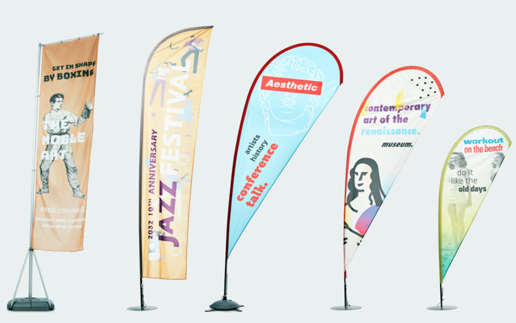Espositori a bandiera: visibilità verticale che cattura l’attenzione! Ideali per eventi, fiere e spazi esterni.Strutture leggere e resistenti con stampe vivaci e grafiche di grande impatto, facili da montare e trasportare.