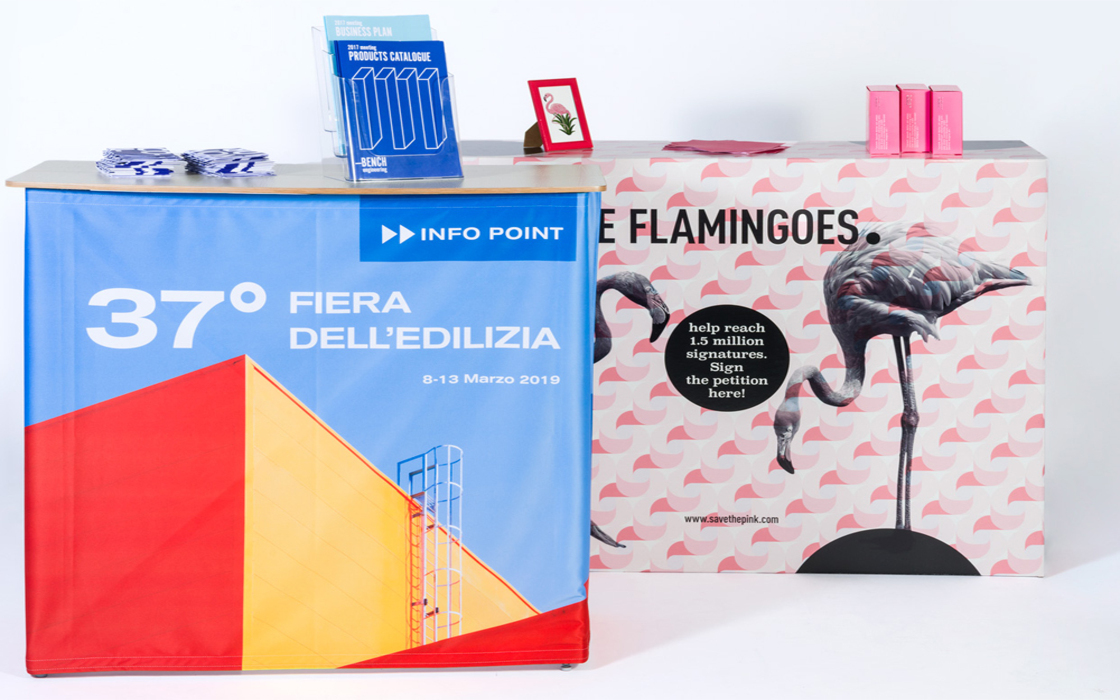 Realizziamo espositori su misura per ogni esigenza: dai banchetti promozionali ai fondali grafici e ai totem